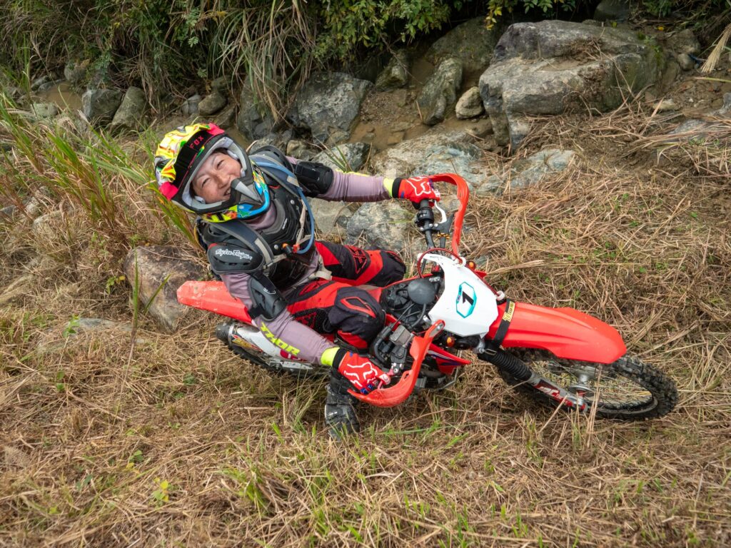全日本モトクロス現役IAの堀越 秀鷹選手には、モトクロスの基礎的な乗り方をレクチャーしてもらうことにしました。堀越選手は、オフロードヴィレッジやリッジパークでも数々のスクールを行っており、各個人の課題を見つけて優しく教えてくれます。かわいい笑顔も素敵!
